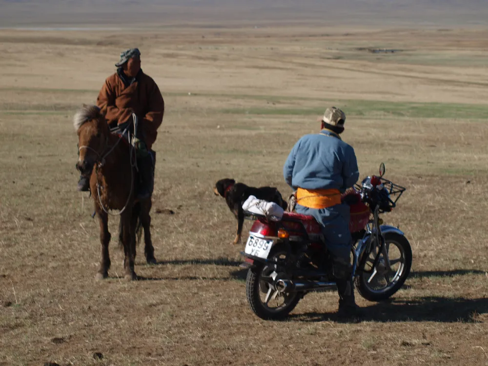 rencontre de deux mongols à cheval et moto dans la steppe par Vincent Dessaint photographe
